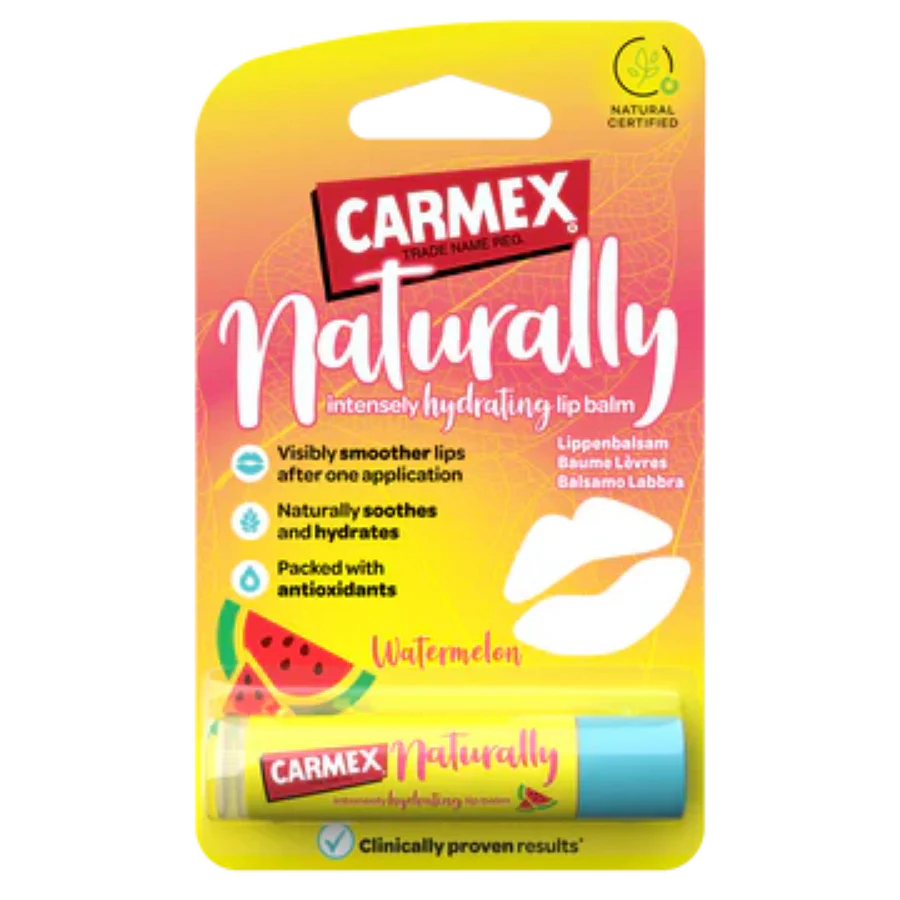 Carmex Naturally Intensely Hydrating Lip Balm Watermelon 4.25g offre une hydratation intense et une protection longue durée pour les lèvres. Ce baume à lèvres met notamment l’accent sur l’utilisation d’ingrédients naturels dans sa formulation. Avec environ 94 % d'ingrédients d'origine naturelle, ce baume à lèvres est enrichi en antioxydants et présente un délicieux arôme de pastèque.