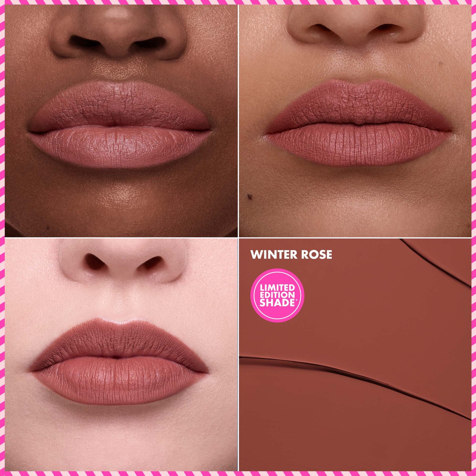 L'ensemble de taches sur les lèvres de crème SEPHORA COLLECTION contient une teinte exclusive pour la saison, la rose d'hiver. Cette édition limitée brun rosâtre fera instantanément ressortir la couleur naturelle de vos lèvres. Mettez en valeur vos lèvres avec ces teintes mates intenses de 10 heures et confortables. Les rouges à lèvres sont livrés dans une adorable pochette en maille dorée prête à l'emploi avec un pompon rose à la mode.