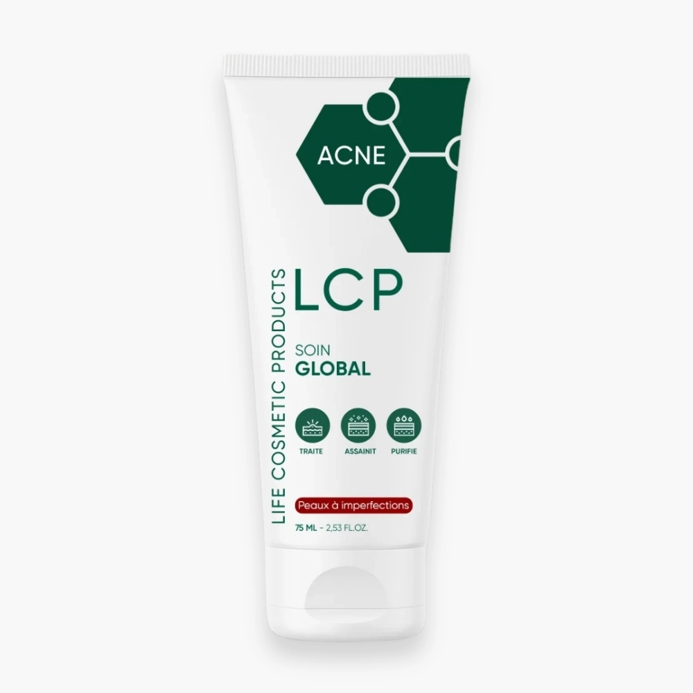 Le Soin Global LCP est une crème de traitement intensif conçue pour cibler l’ensemble des problématiques des peaux grasses à tendance acnéique, incluant les boutons inflammatoires, les points noirs, les pores obstrués, les rougeurs et les marques post-acné. Ce soin complet agit à tous les niveaux de la formation des imperfections grâce à une formule hautement concentrée qui exfolie, assainit et apaise l’épiderme.